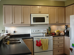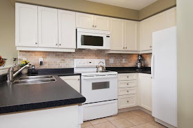 Usually when I stage a home for resale, the realtor calls me only a few days before it goes on the market. This doesn't give the homeowner enough time to ready their home and show it at its best. Sometimes I have clients who contact me directly months before the For Sale sign goes up and who are willing to put some effort and money into staging their home. One of these clients was able to turn a dated kitchen (think pickled oak cabinets) into a fresh, welcoming space using paint and inexpensive tumbled marble backsplash tiles.