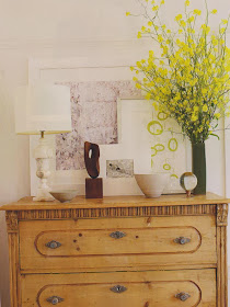I just received my October House Beautiful in the mail and instantly fell in love with this arrangement by stylist Arron Hom. One of the things I love about this magazine are it's insightful interviews with the designers of the featured homes. You can glean decorating and design advice and an understanding of why the designer made a particular decision. He says this grouping on a vintage dresser in his bedroom began with the large photo of a bale of recycled paper (who would have thought?): "When I put that green print in front of it, I knew I should do a display." He also says "I played with that assemblage on the dresser like I was an architect working on a city skyline" referring to the heights and shapes of the pieces. What a wonderful way to look at pulling together a collection of disparate objects to create a poignant and beautiful grouping.
